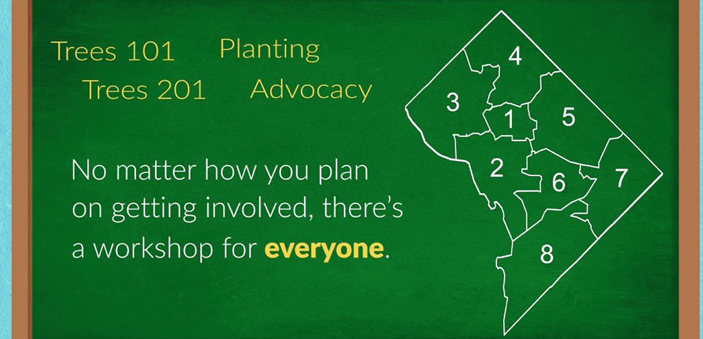 Not so keen on the great outdoors? You can still help us advocate for trees all across D.C. – no dirt necessary. From Trees 101 to Stand Up for Trees, check out our workshops to learn why trees matter (cleaner air and water, anyone?) and how your public comments can influence development decisions throughout the city.