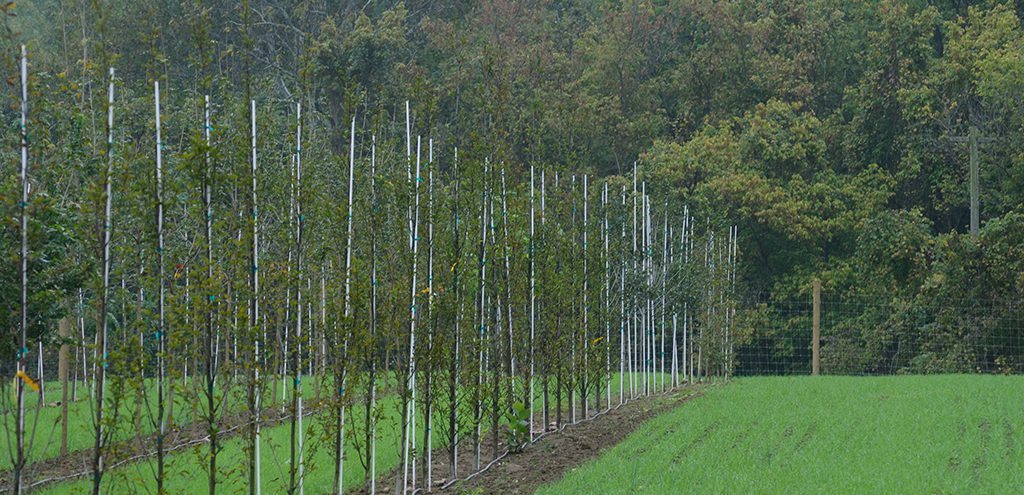 Each tree is pruned at least once a year, with the aim of getting a balance of thickness to height and a strong central leader. The stakes flex in the wind, and this movement encourages a stouter trunk.