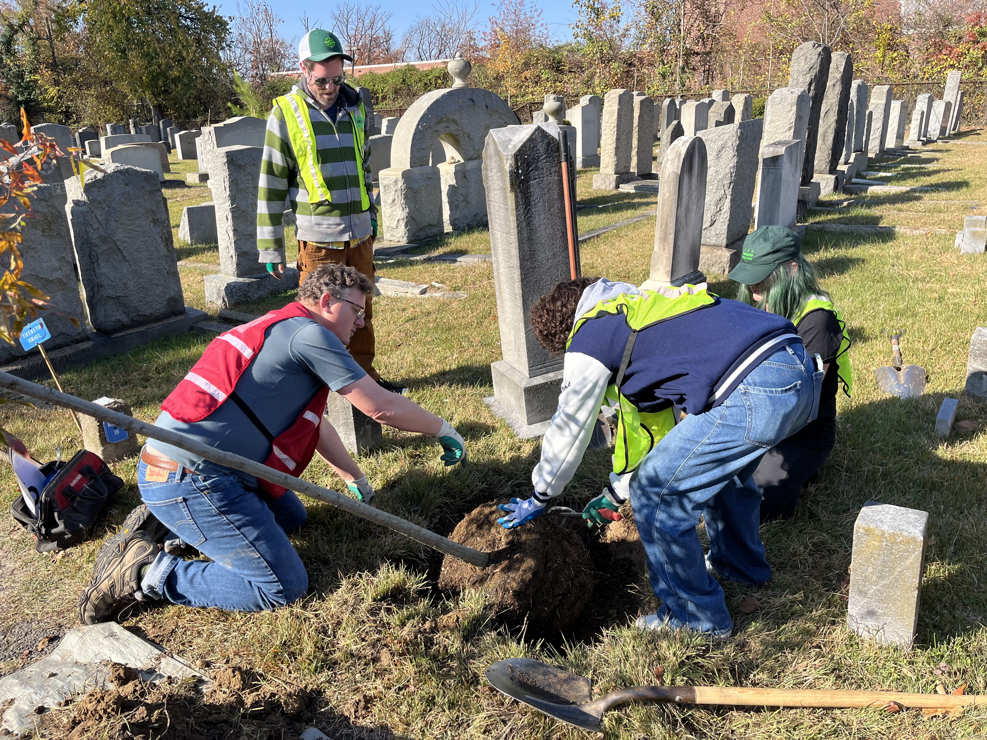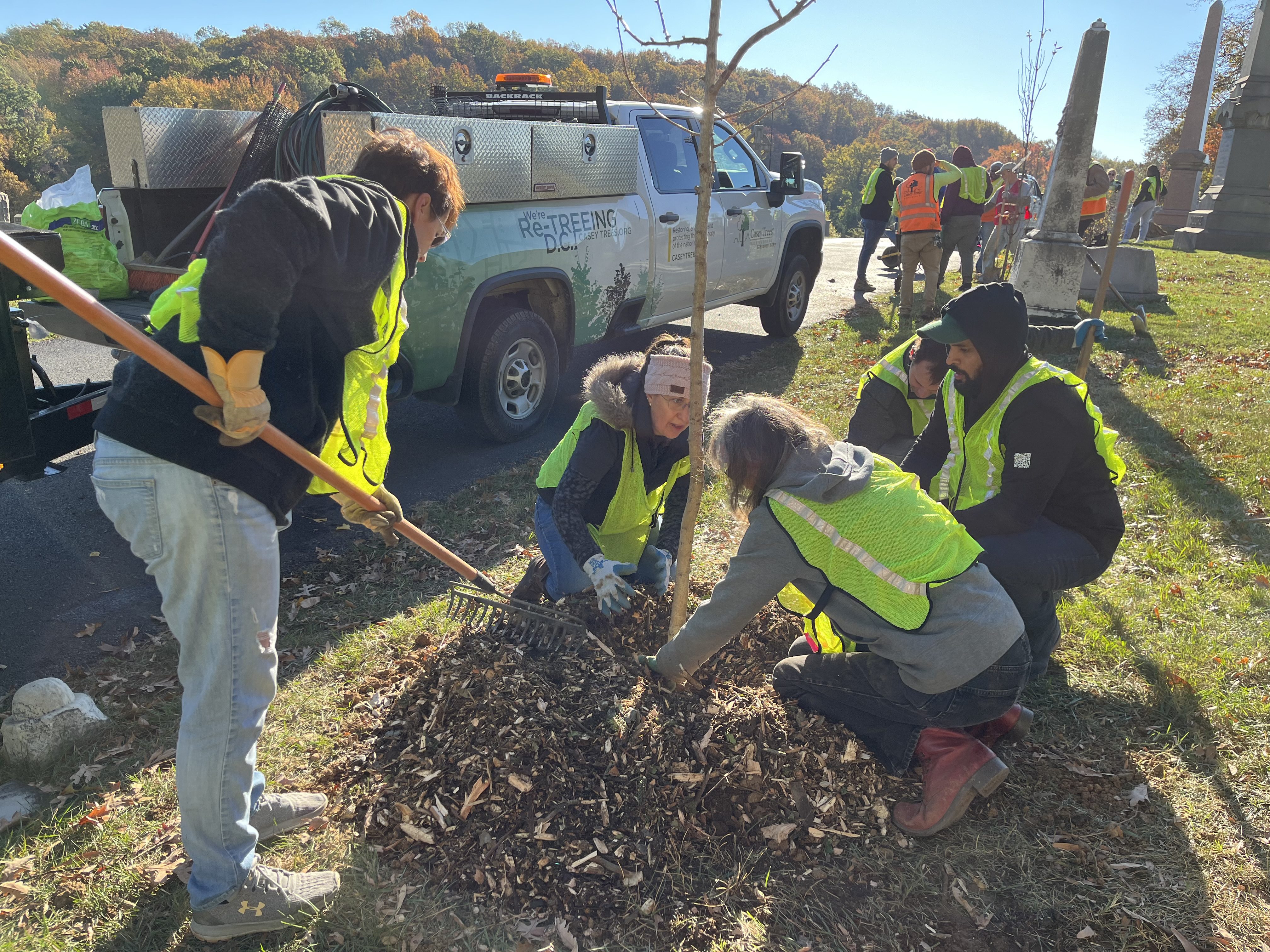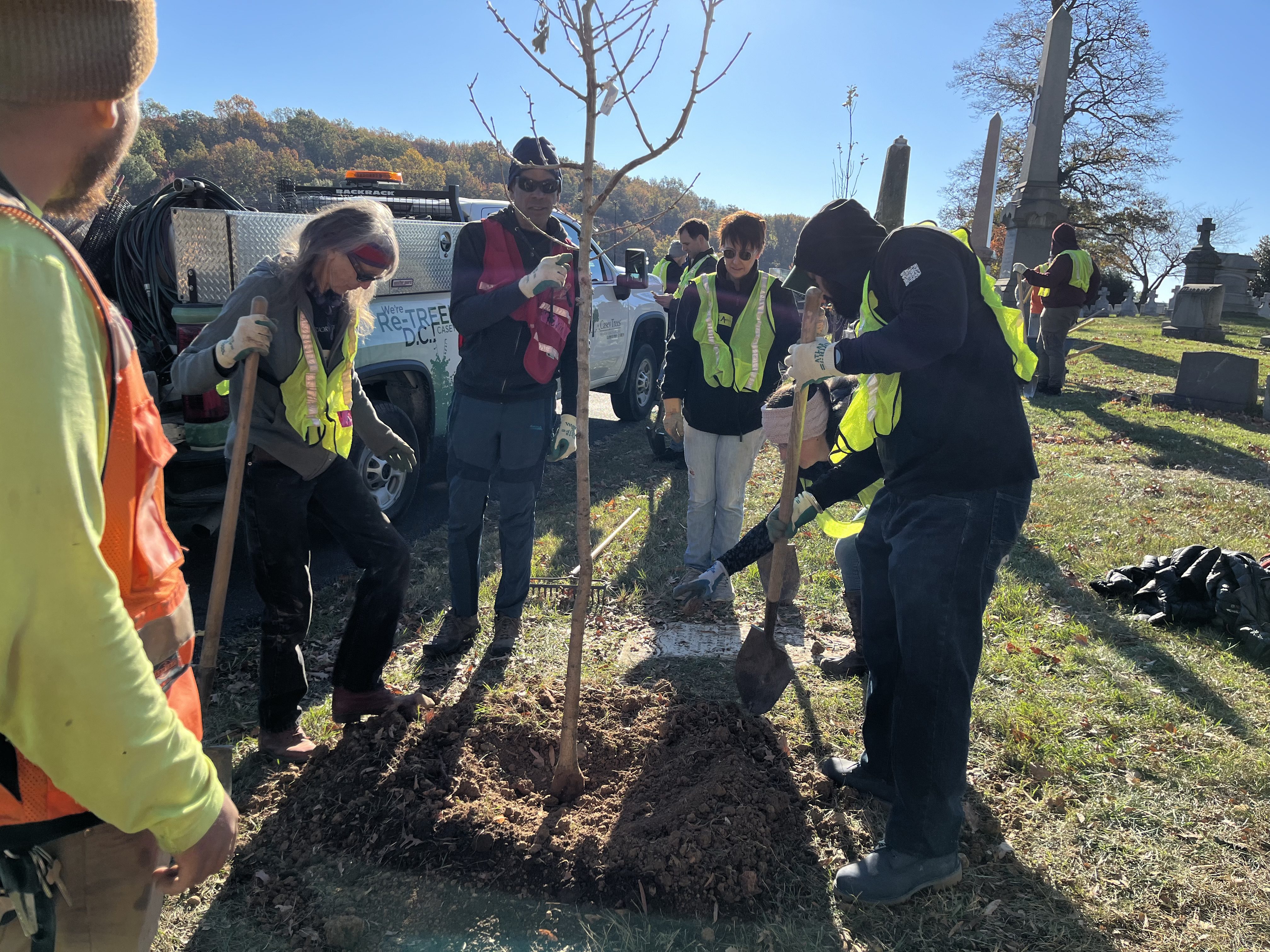 Our first planting of the month was held at the historic Mount Olivet Cemetery. Here, we worked to add even more trees to the 1,000+ that we have already planted! Volunteers worked together to plant a variety of native tree species, contributing not only to the beautification of the cemetery but also to the overall health of the urban environment.