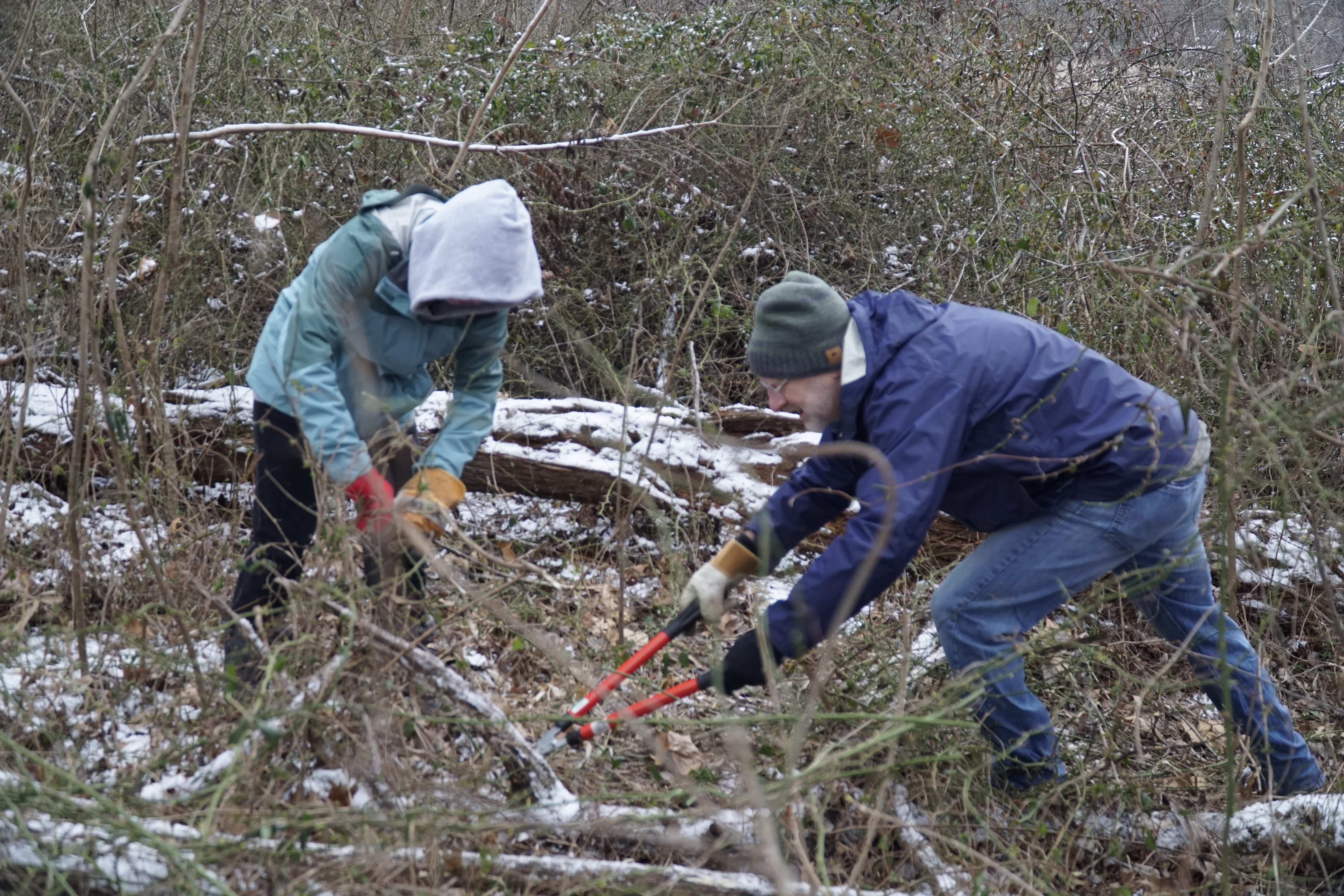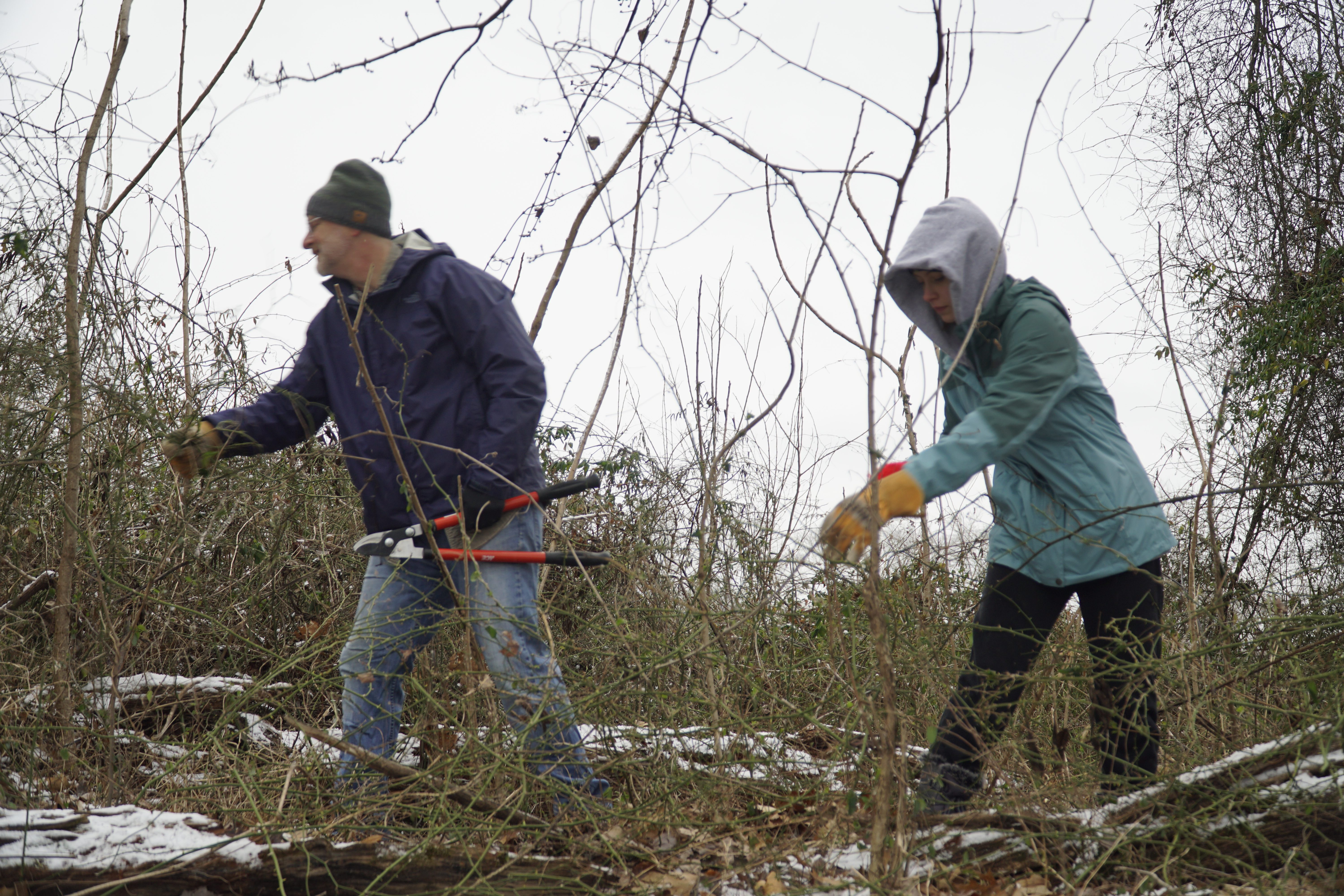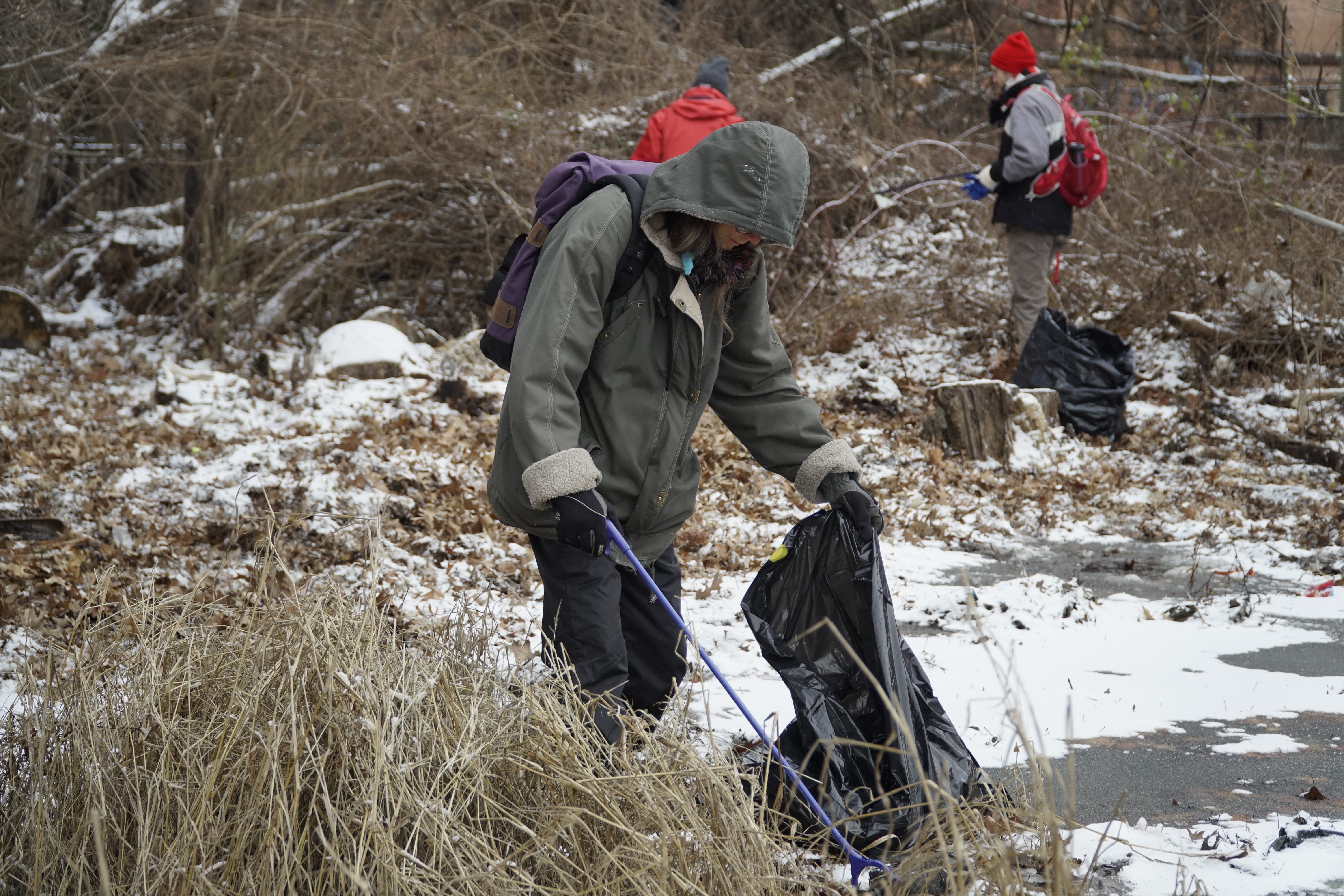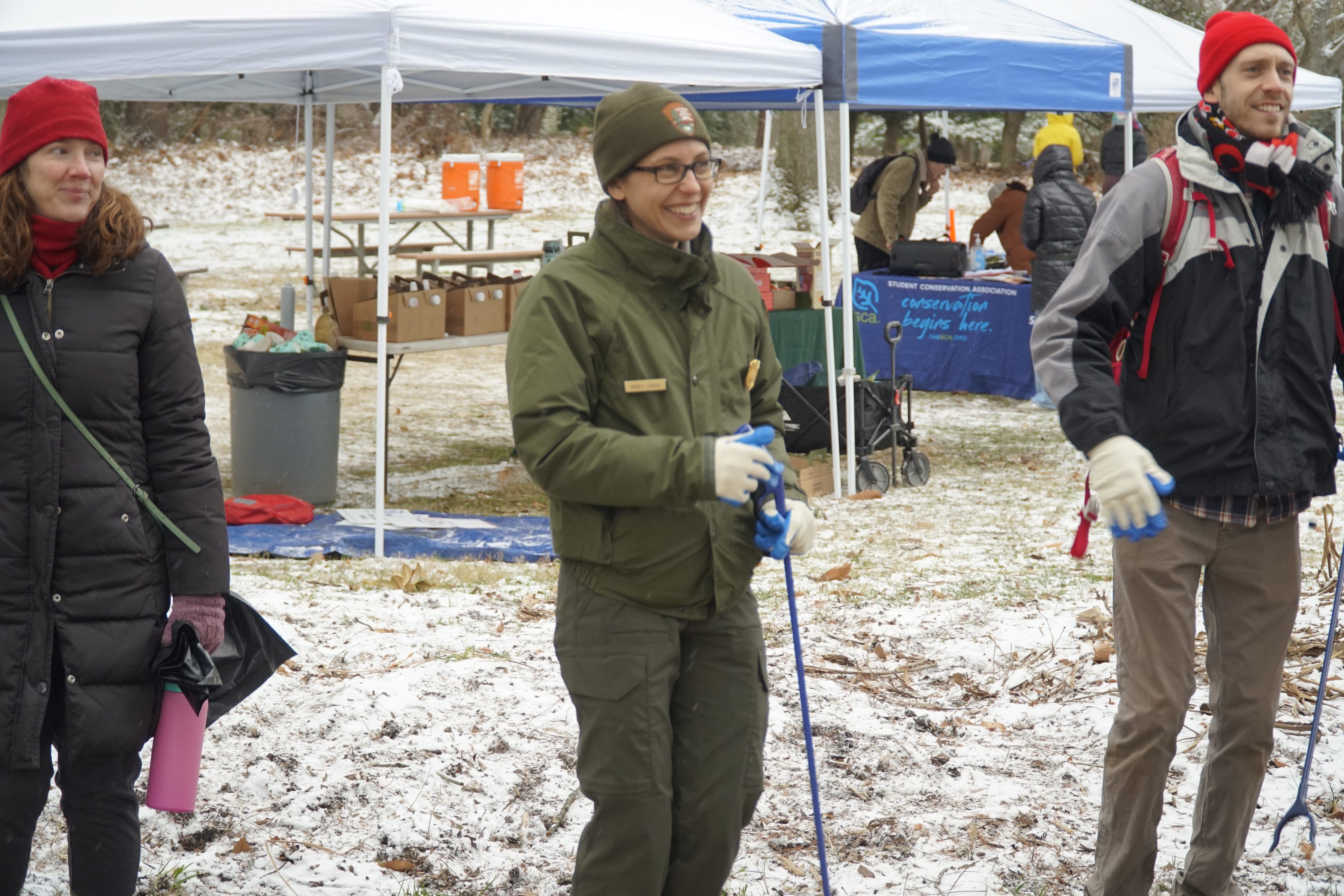 We were joined by the SCA, Friends of Kenilworth Aquatic Gardens, Representatives from the National Park Service, and Americorps. Dedicated volunteers met us at Kenilworth Aquatic Gardens on the snowy Monday morning to give back through trash clean-up and invasive removal. With our invasive plant removal efforts yesterday, volunteers were hard at work pulling english ivy vines and chopping up honeysuckle shrubs. And although it was hard to see the forest from the weeds at the beginning of the day – by the time we left, it didn’t even look like the same park. It’s amazing to see what can be accomplished with a little TLC!