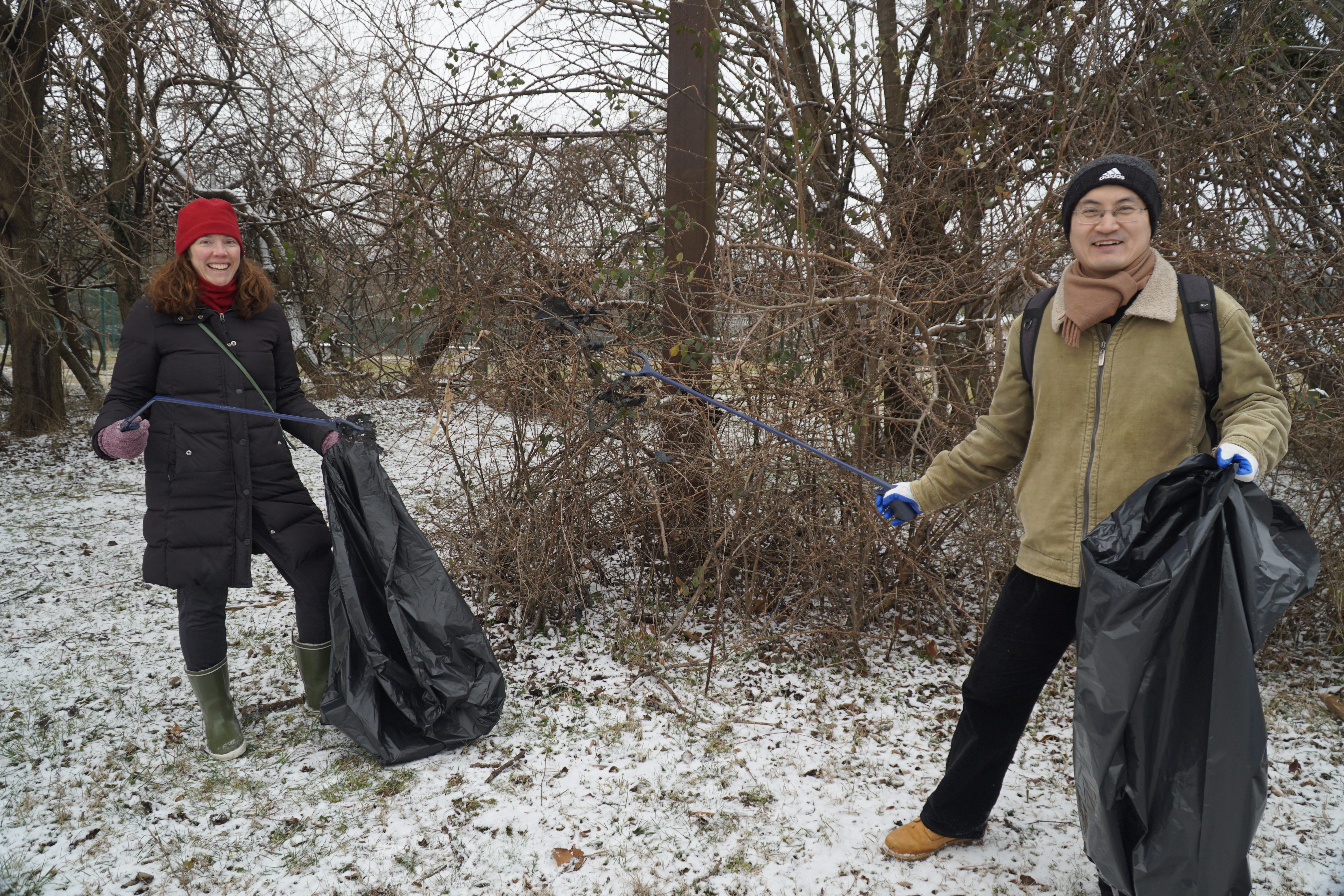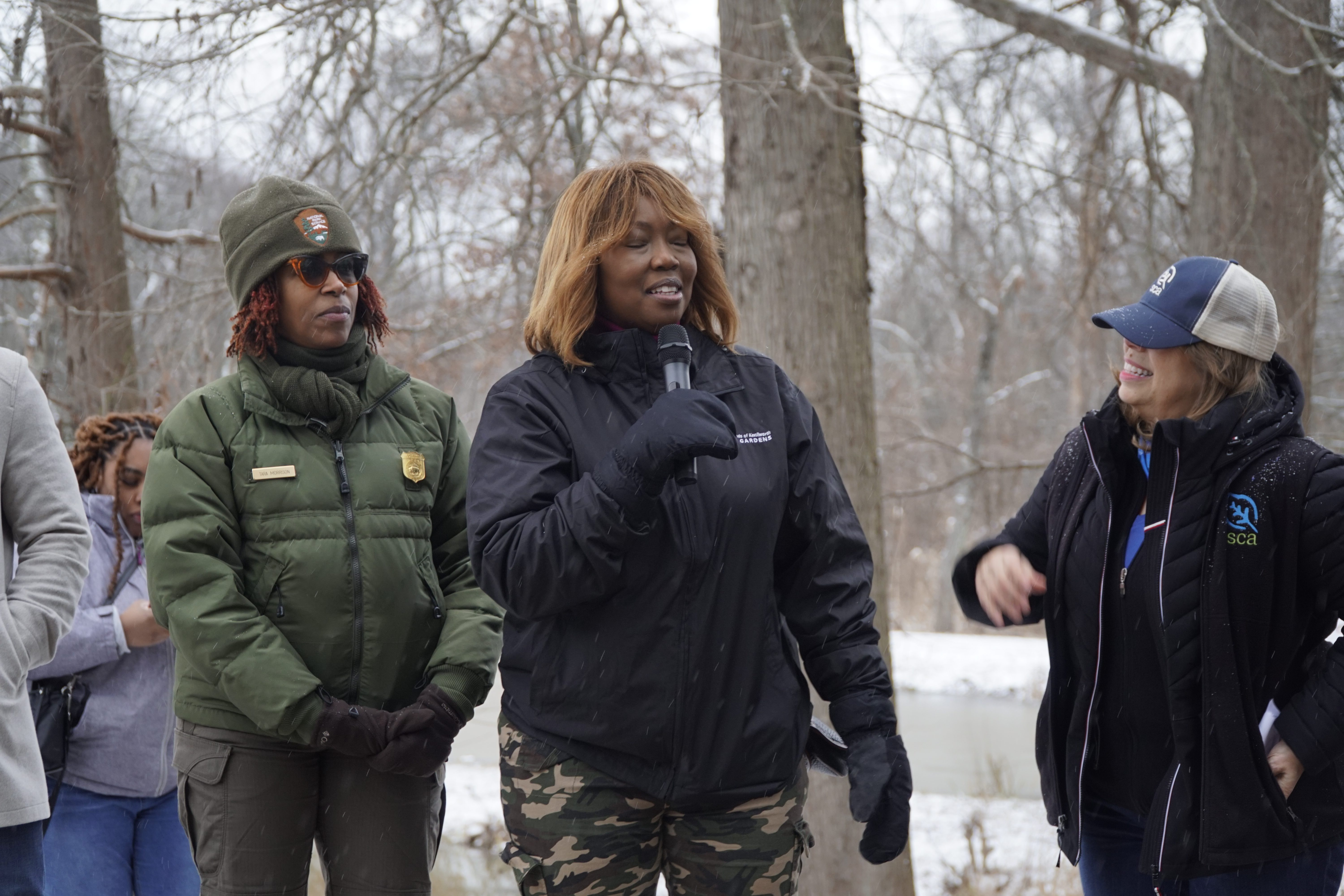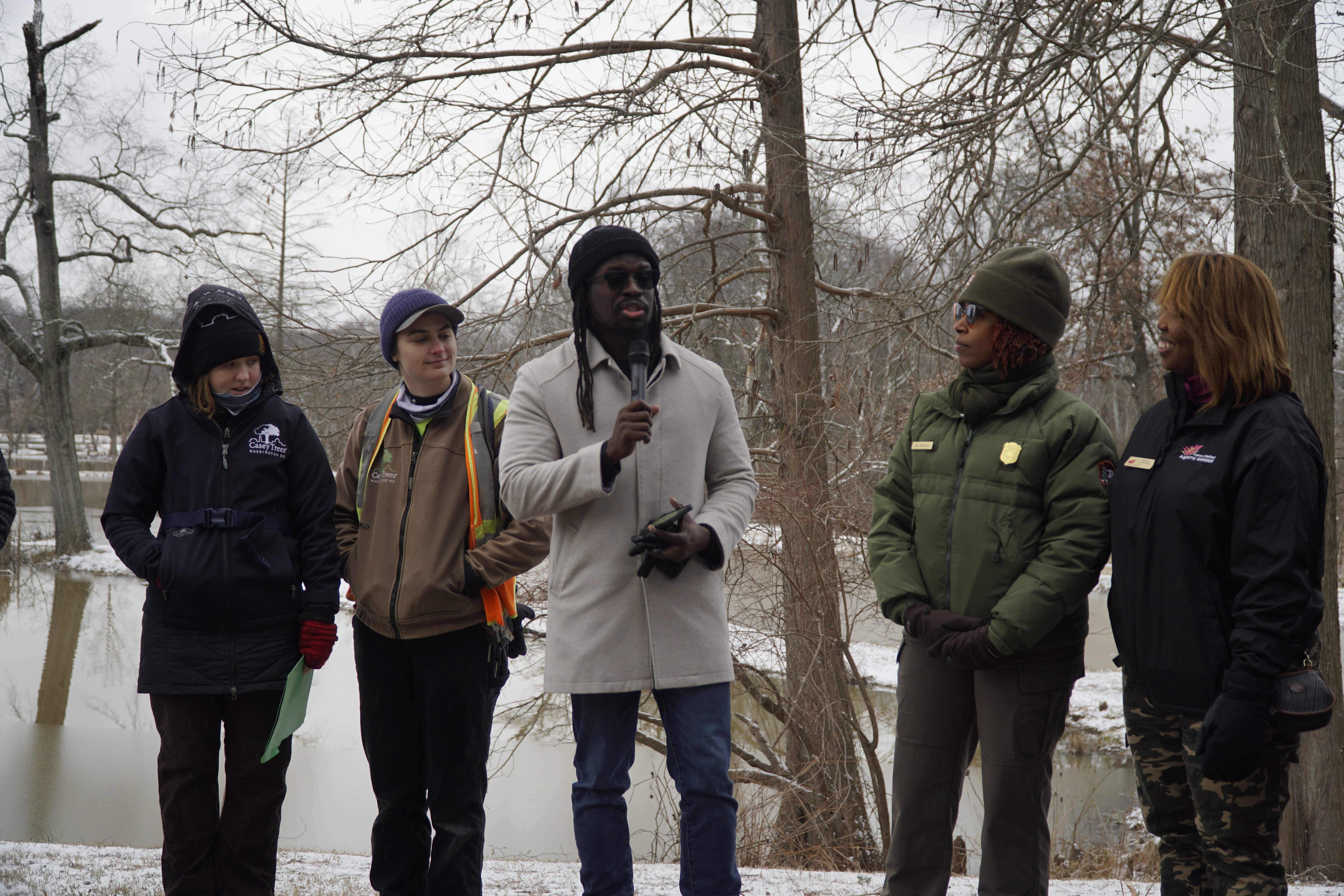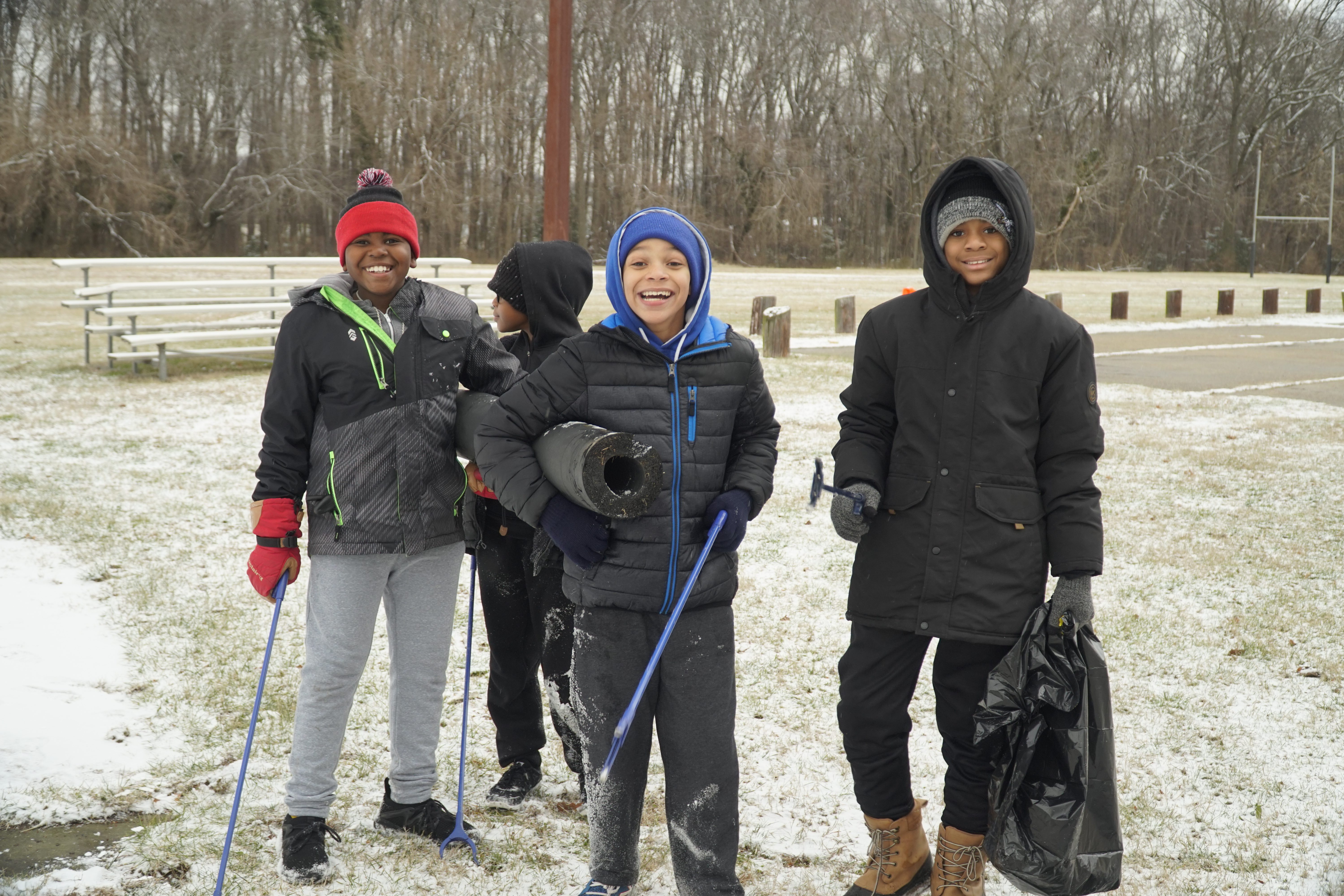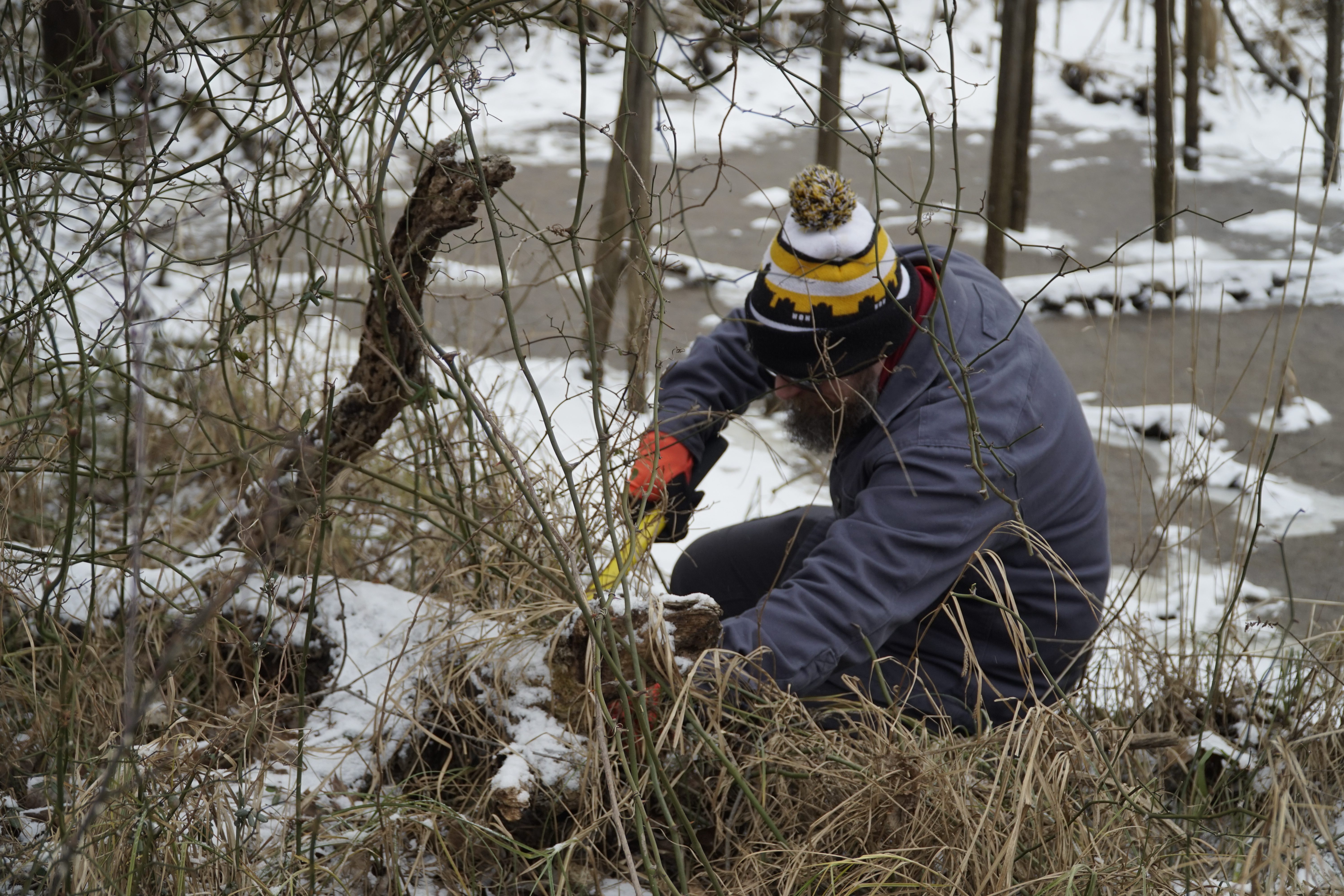 We were joined by the SCA, Friends of Kenilworth Aquatic Gardens, Representatives from the National Park Service, and Americorps. Dedicated volunteers met us at Kenilworth Aquatic Gardens on the snowy Monday morning to give back through trash clean-up and invasive removal. With our invasive plant removal efforts yesterday, volunteers were hard at work pulling english ivy vines and chopping up honeysuckle shrubs. And although it was hard to see the forest from the weeds at the beginning of the day – by the time we left, it didn’t even look like the same park. It’s amazing to see what can be accomplished with a little TLC!
