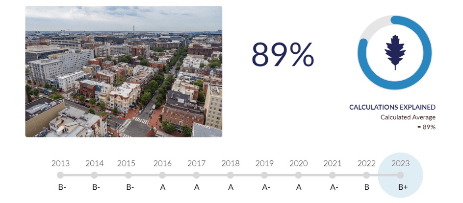 This is why we publish our Tree Report Card, Casey Trees’ independent evaluation of DC’s urban forest. It looks at where our successes have been over the past year and highlights where improvements can be made. We publish this report each year to guide our efforts, and those of our partners, to measure progress toward achieving the District’s 40% tree canopy goal, and to inform on the health and condition of DC’s trees. This year, the District received an overall grade of B+.