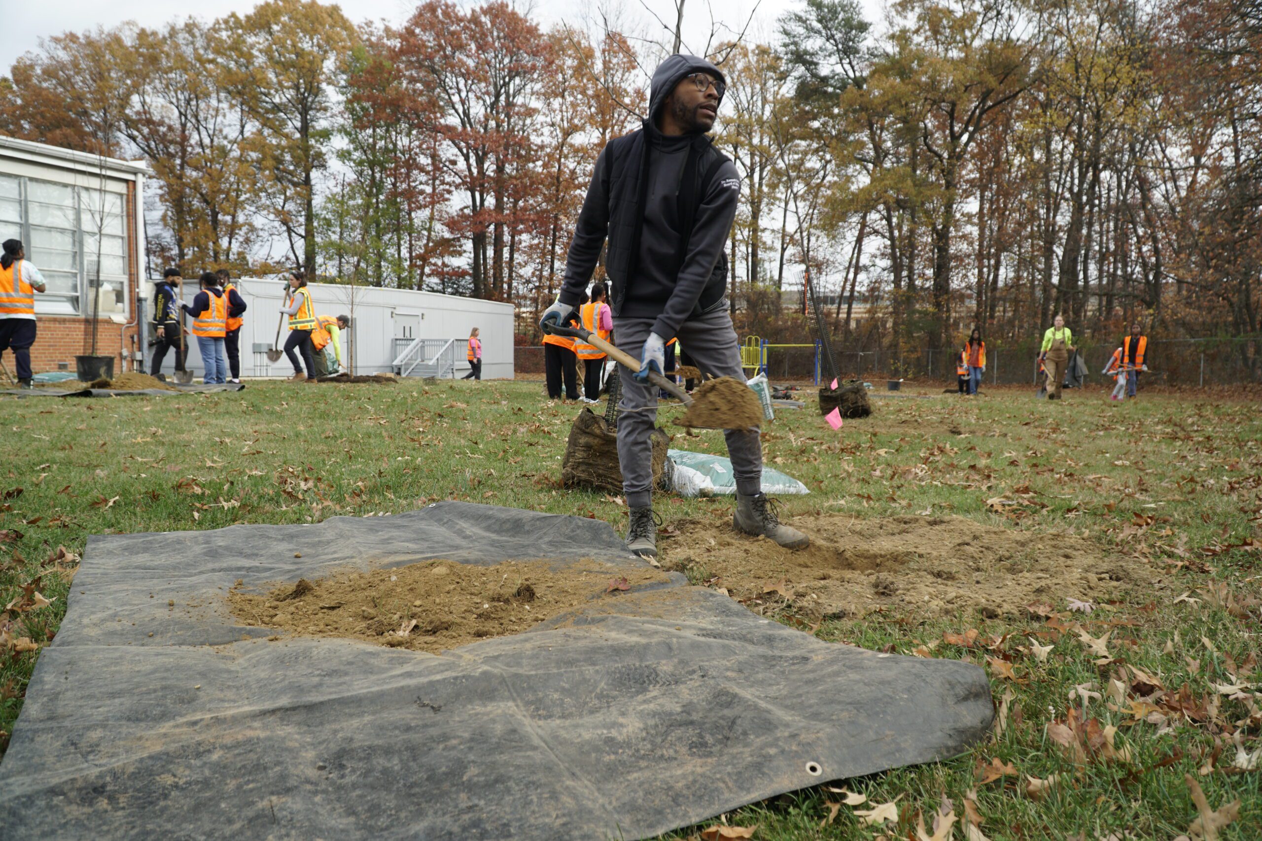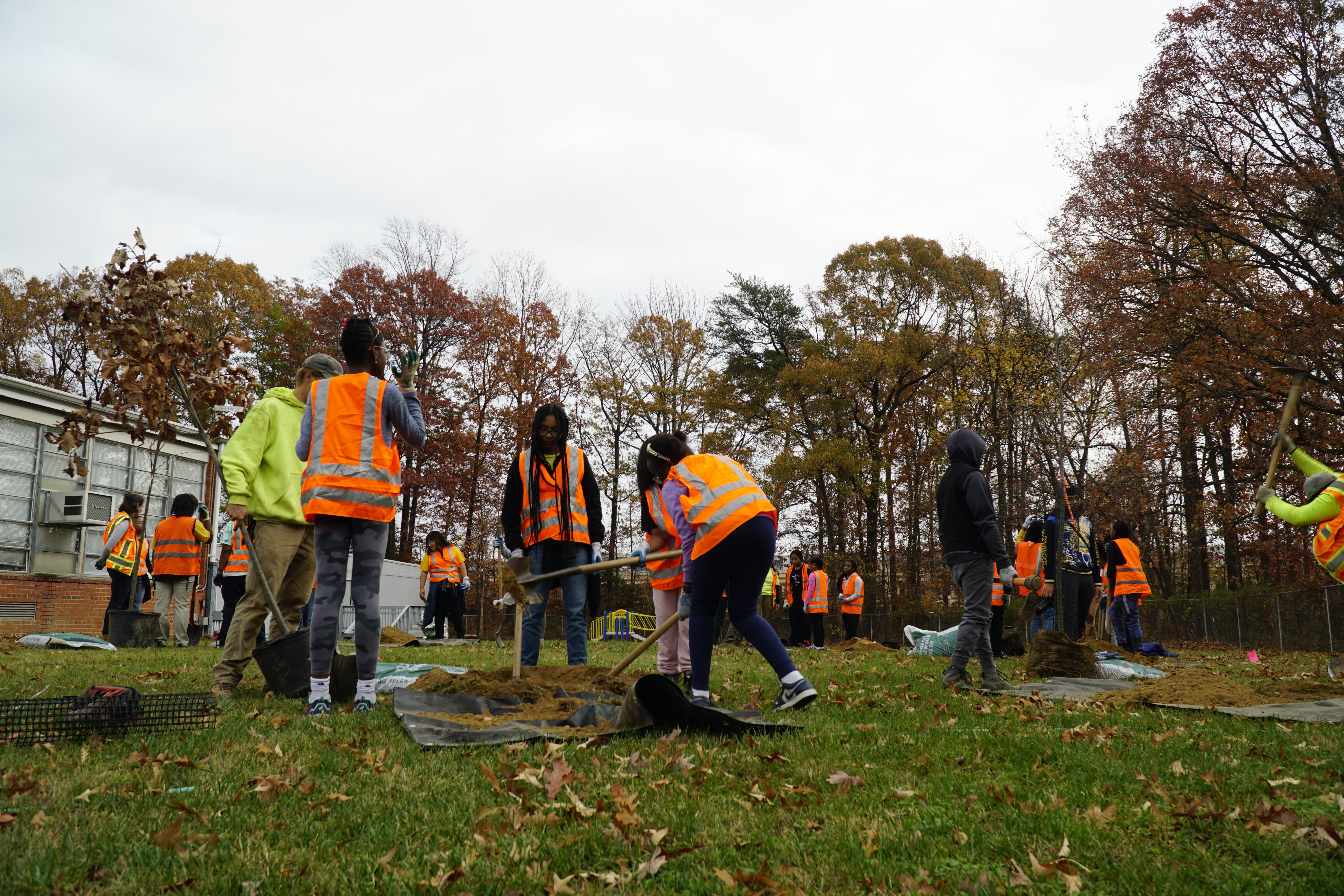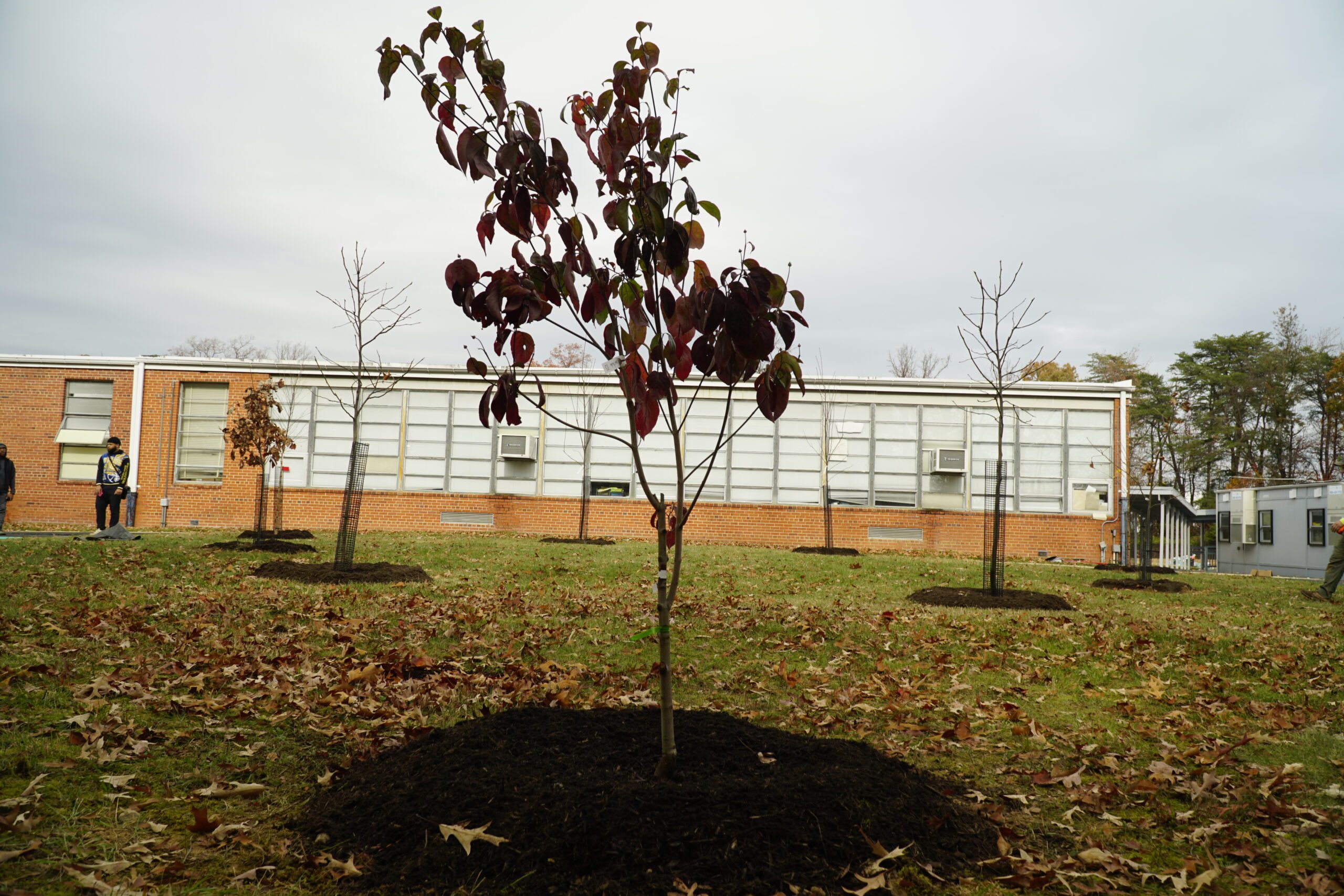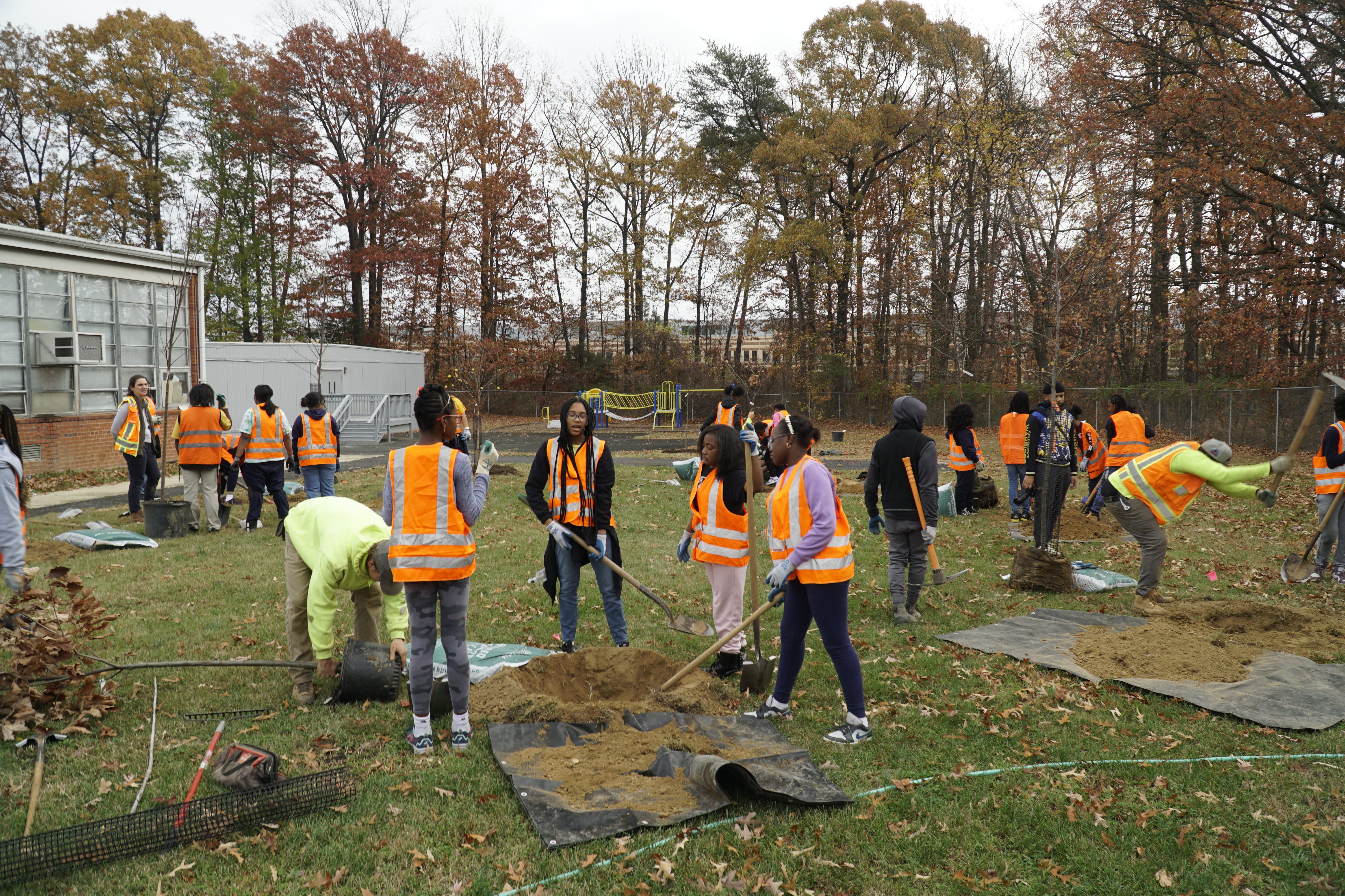 While planting, Dr. Harris shared some insight into the future legacy of these trees. “Seeing the impacts of climate change through the lens of orbital technology you’ve designed is a pretty unique experience. But collaborating to do something about it with students learning in the same public school system that raised me, is an experience I’ll never forget. In PGCPS, we’re serious about our scholar’s experience both in and out of the schoolhouse. There’s no better way to engage and encourage our future world changers than by lifting lessons off the pages of their textbooks. All while reinforcing the need to protect their home planet and communities through sustainable & conscientious choices. Planting at Benjamin D. Foulois and Imagine Morningside helps us move the needle for the entire city of Morningside, positioned inside the beltway near an active Air Force base. The participation of our scholars, school leaders, and Casey Trees will work to improve air quality, amongst other benefits, for generations to come.”