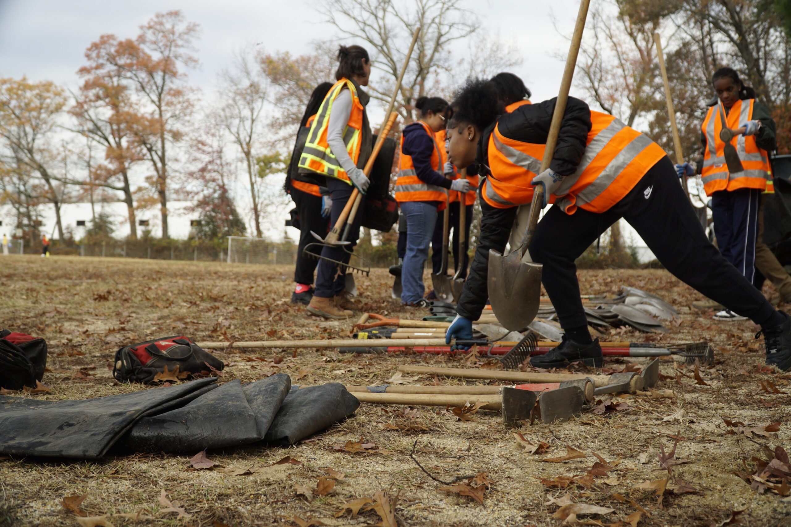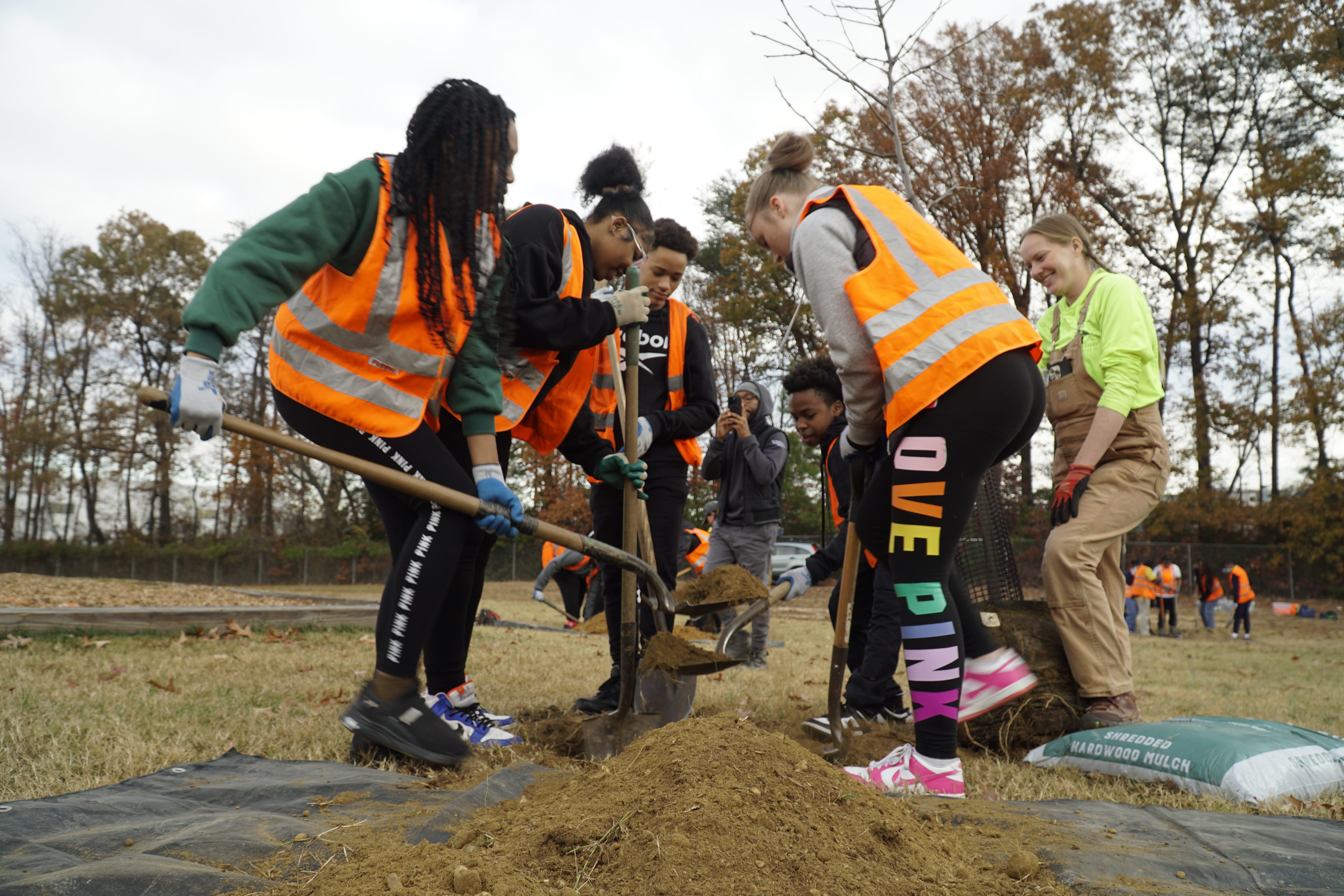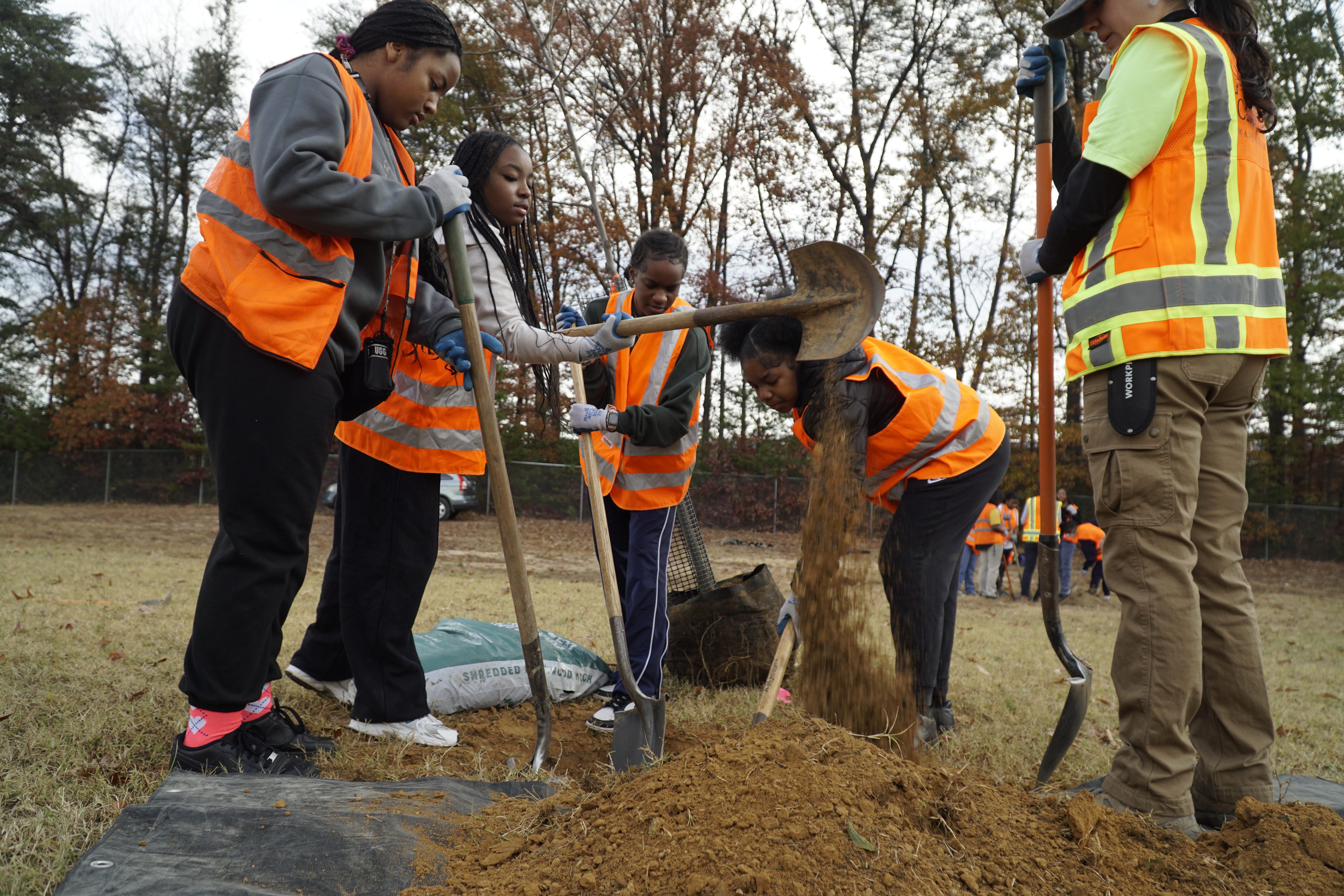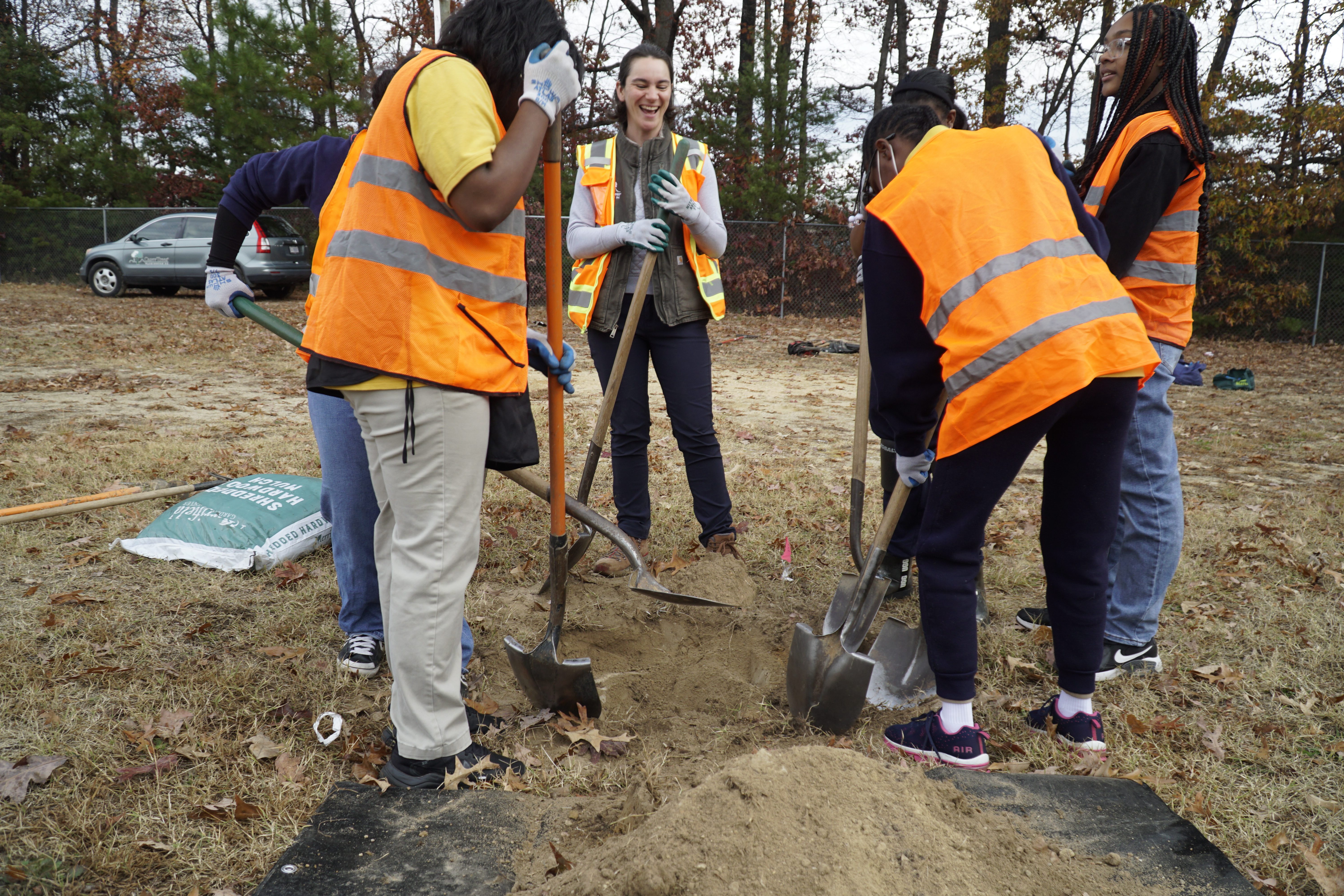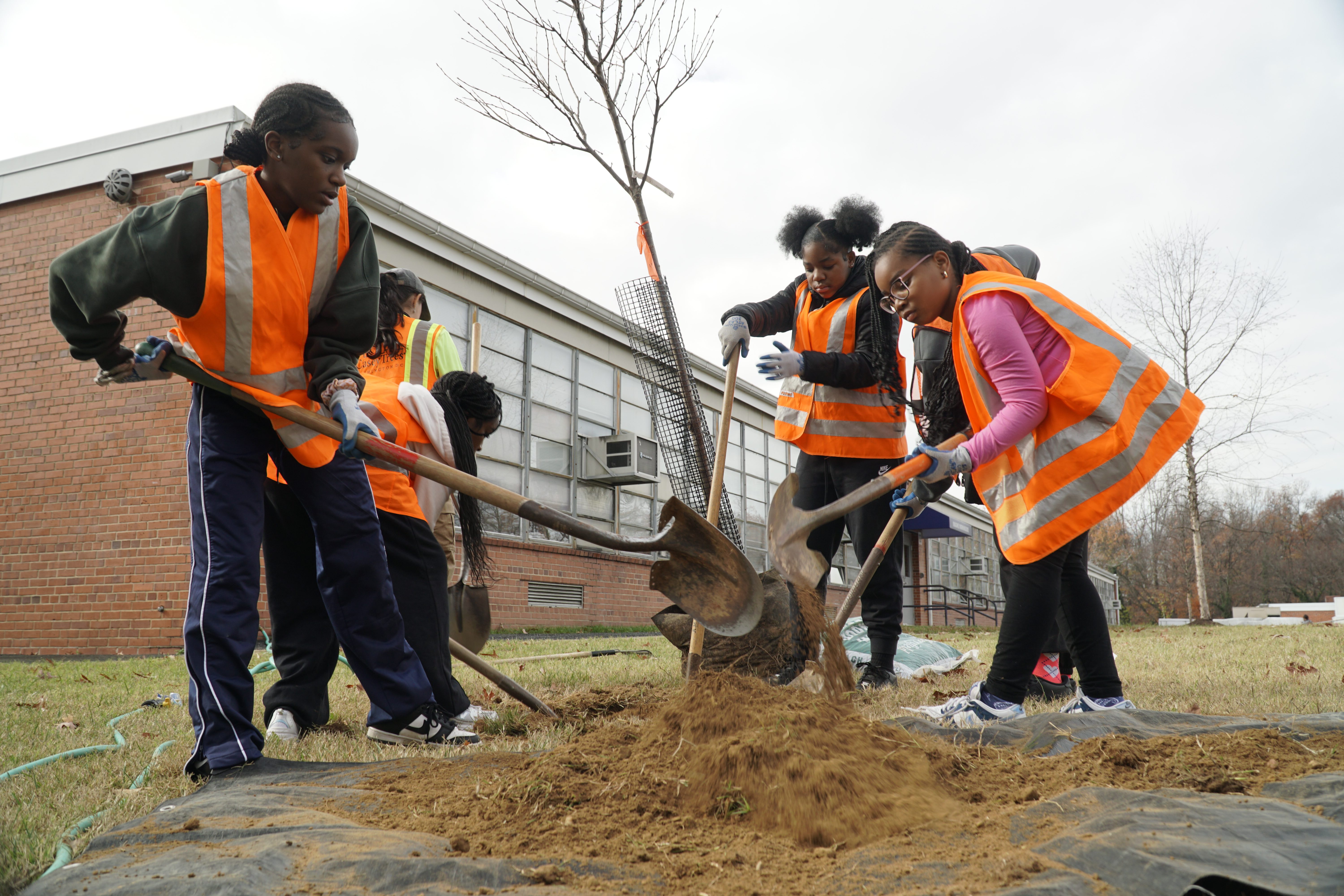 While planting, Dr. Harris shared some insight into the future legacy of these trees. “Seeing the impacts of climate change through the lens of orbital technology you’ve designed is a pretty unique experience. But collaborating to do something about it with students learning in the same public school system that raised me, is an experience I’ll never forget. In PGCPS, we’re serious about our scholar’s experience both in and out of the schoolhouse. There’s no better way to engage and encourage our future world changers than by lifting lessons off the pages of their textbooks. All while reinforcing the need to protect their home planet and communities through sustainable & conscientious choices. Planting at Benjamin D. Foulois and Imagine Morningside helps us move the needle for the entire city of Morningside, positioned inside the beltway near an active Air Force base. The participation of our scholars, school leaders, and Casey Trees will work to improve air quality, amongst other benefits, for generations to come.”