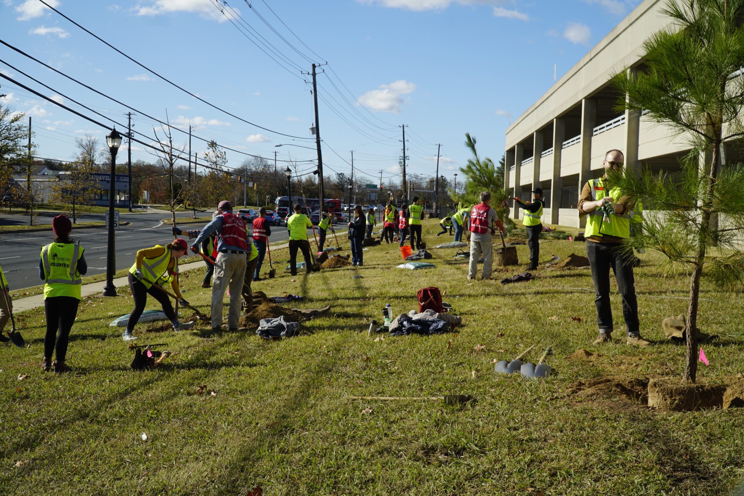 The planting effort at Suitland Metro Station unfolded in two phases. The Casey Trees forestry crew began the project by planting 53 native trees, including hollies, pines, and maples. Following this foundational work, the local community joined forces to plant an additional 51 trees, bringing the total to over 100 trees at this station.