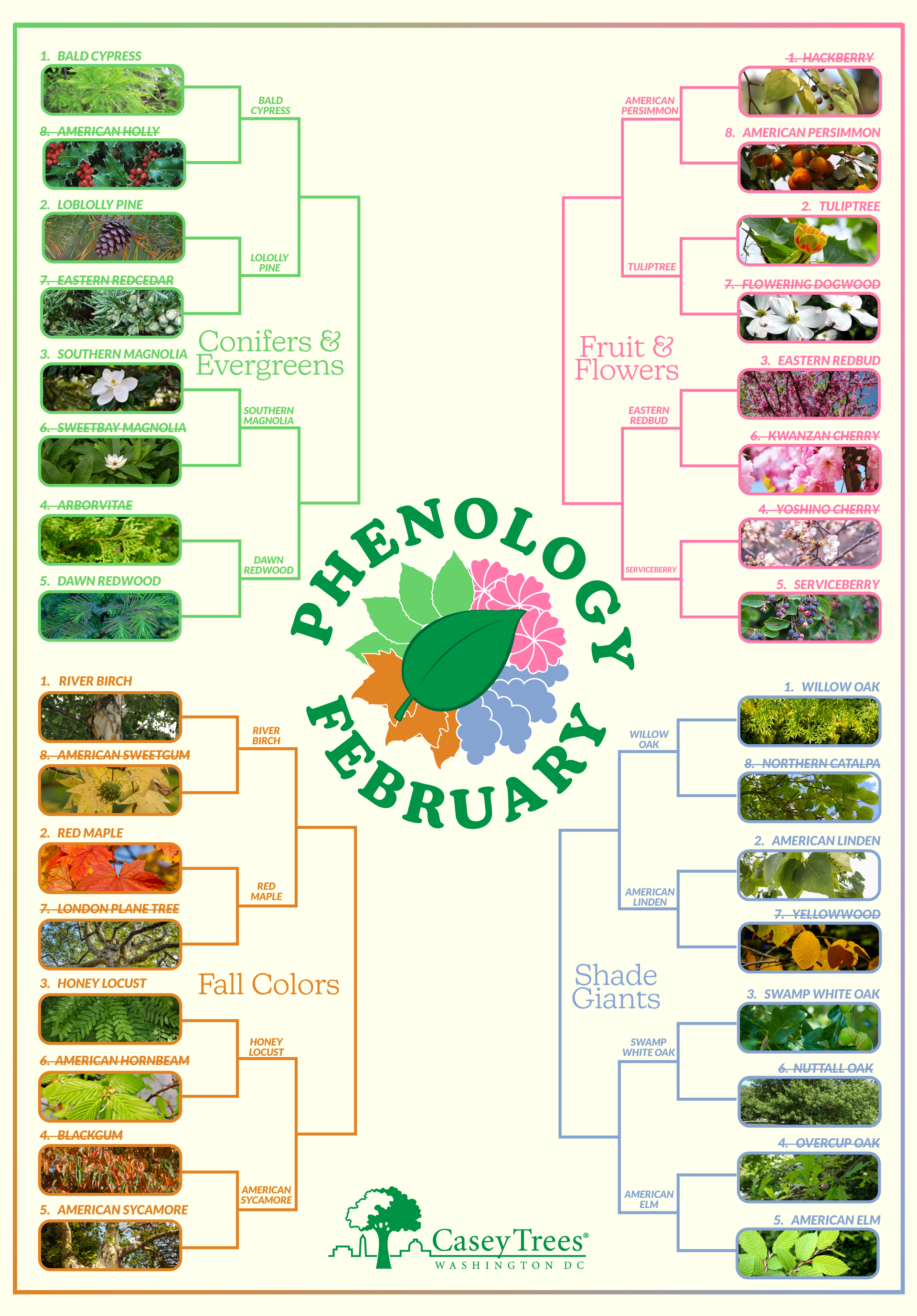 Well, tree lovers – never fall victim to this FOMO again! Get ready to slam dunk into the arboreal arena with Casey Trees’ second annual Phenology February! It’s time to leaf the ordinary behind and root for your favorite tree in a March Madness-style showdown like never before.