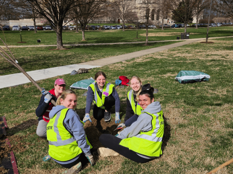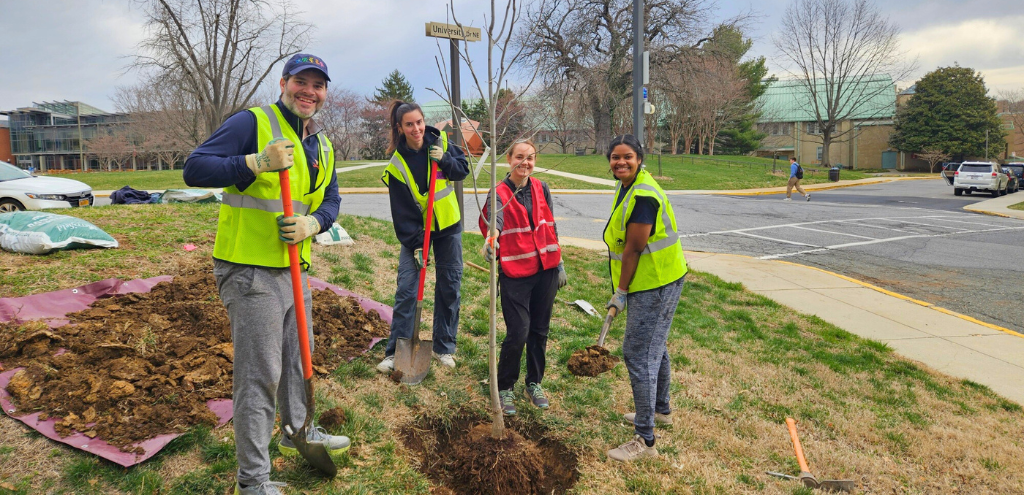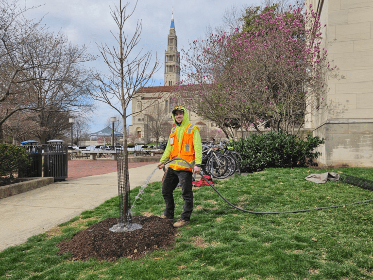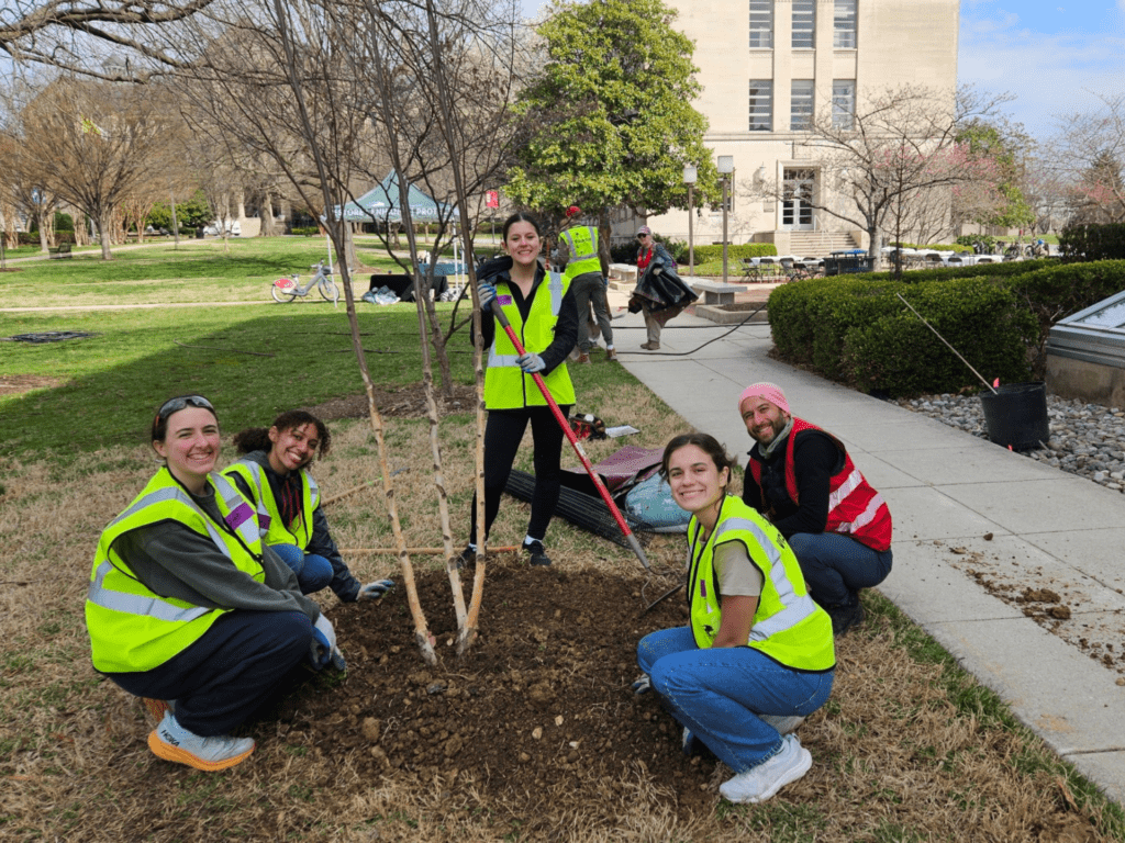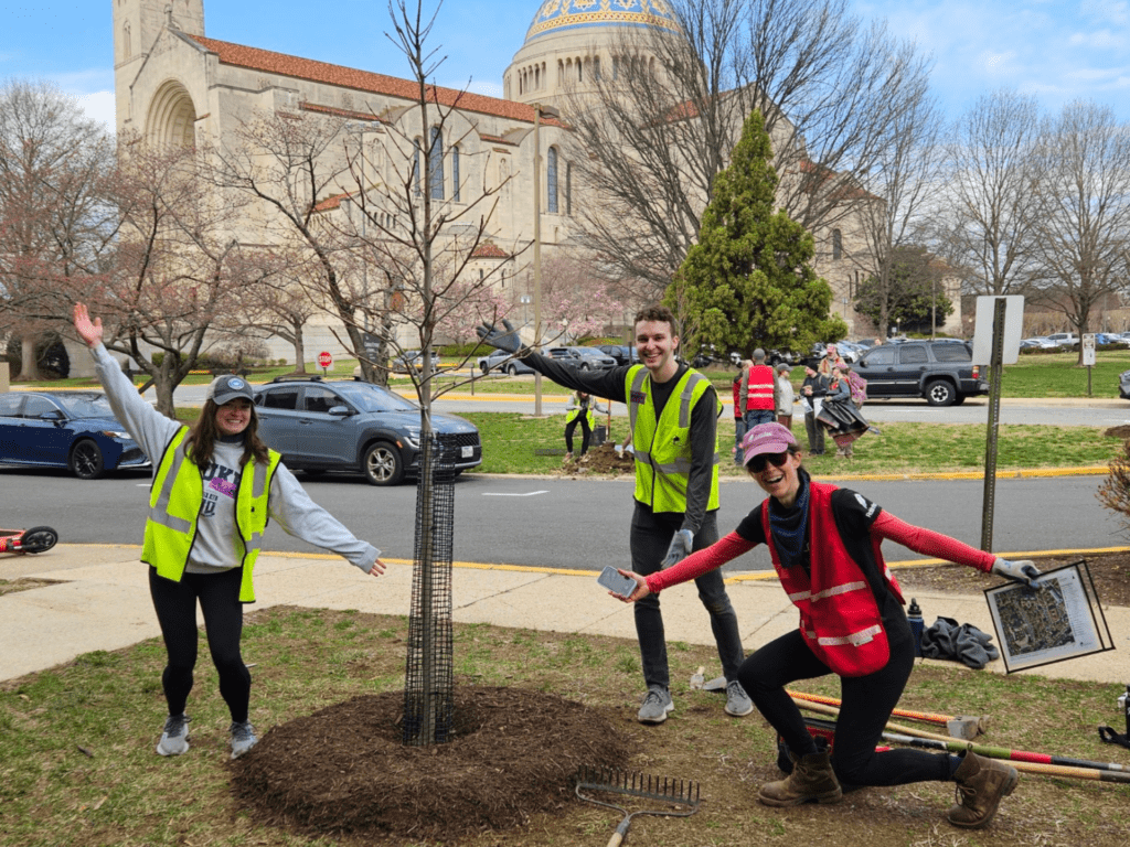 At this most recent planting, we added over 40 trees with the help of our dedicated Team Leaders, volunteers, and university students. These trees are critical to both our city and CUA students as they will grow into a lush shade canopy on University Mall—where commencement is held every year—providing cooler, healthier air for generations of students to come.