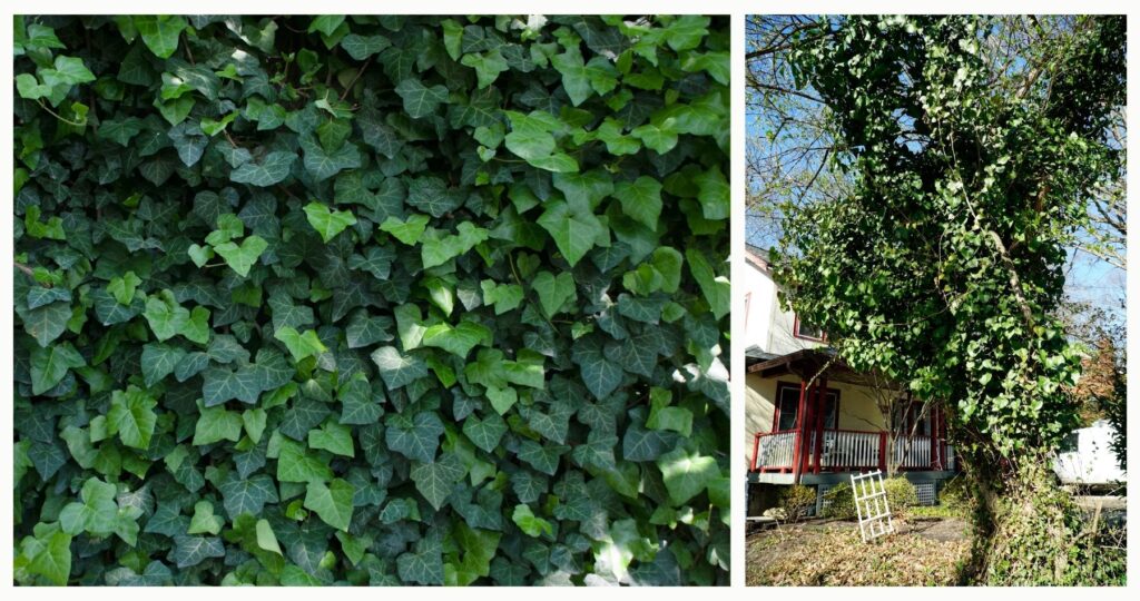 English ivy’s leaves are waxy in texture, and older plants produce greenish-white flowers and blue/black berries, which are dispersed by birds and other animals which is one reason it’s so invasive. Through our partnership with CCAN, we host invasive vine removals every month to save our community’s trees from this persistent plant.