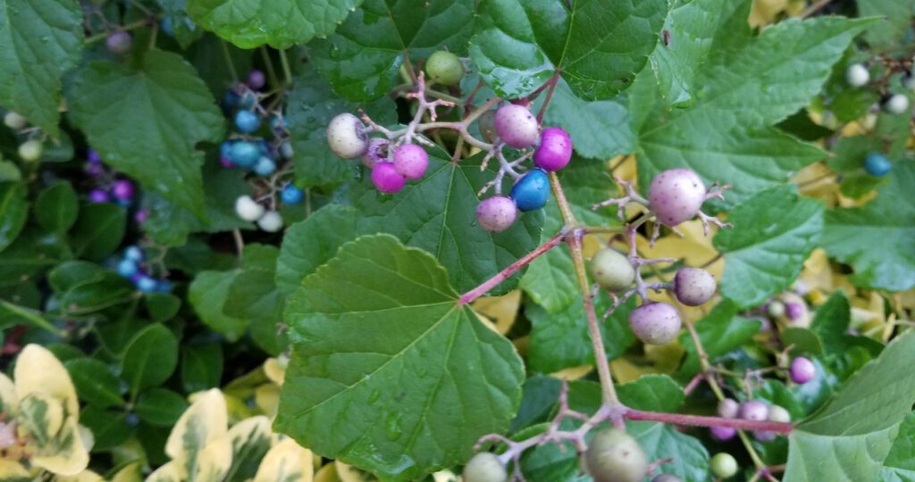It’s worth noting that porcelain berry closely resembles some native, wild grape vines. One big distinction: The bark of native grape vines shreds or peels while the porcelain berry’s does not. Additionally, the inside of a native grape’s stem is brown while the porcelain berry’s is white.