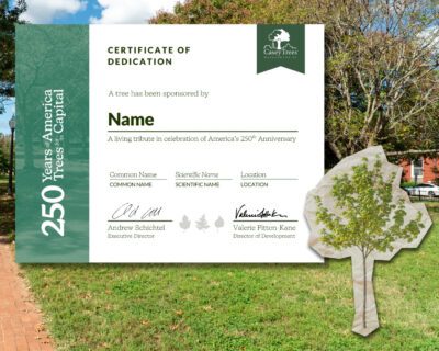 Just in time for the holidays, we recently launched our 250 Years of America, 250 Trees for its Capital campaign, in partnership with the National Park Service. The goal is to plant 250 native and historic trees across DC’s national parks—and what better way to honor a loved one than by giving a gift that will continue to grow. For $500, you can sponsor and dedicate a professionally planted tree in one of DC’s historic national parks. With this donation, you will receive a certificate addressed to the honoree, showing the tree’s species and the park where it is located. Better yet, this makes for a great last-minute gift—we’ll email you a print-at-home certificate, perfect for framing or slipping into a card. Only 250 of these trees will be dedicated and planted at these historic national parks, and only a handful in parks on Capitol Hill and DC, so be sure to dedicate your tree soon.