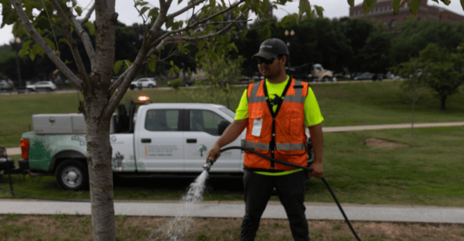 A man watering a tree with a hose